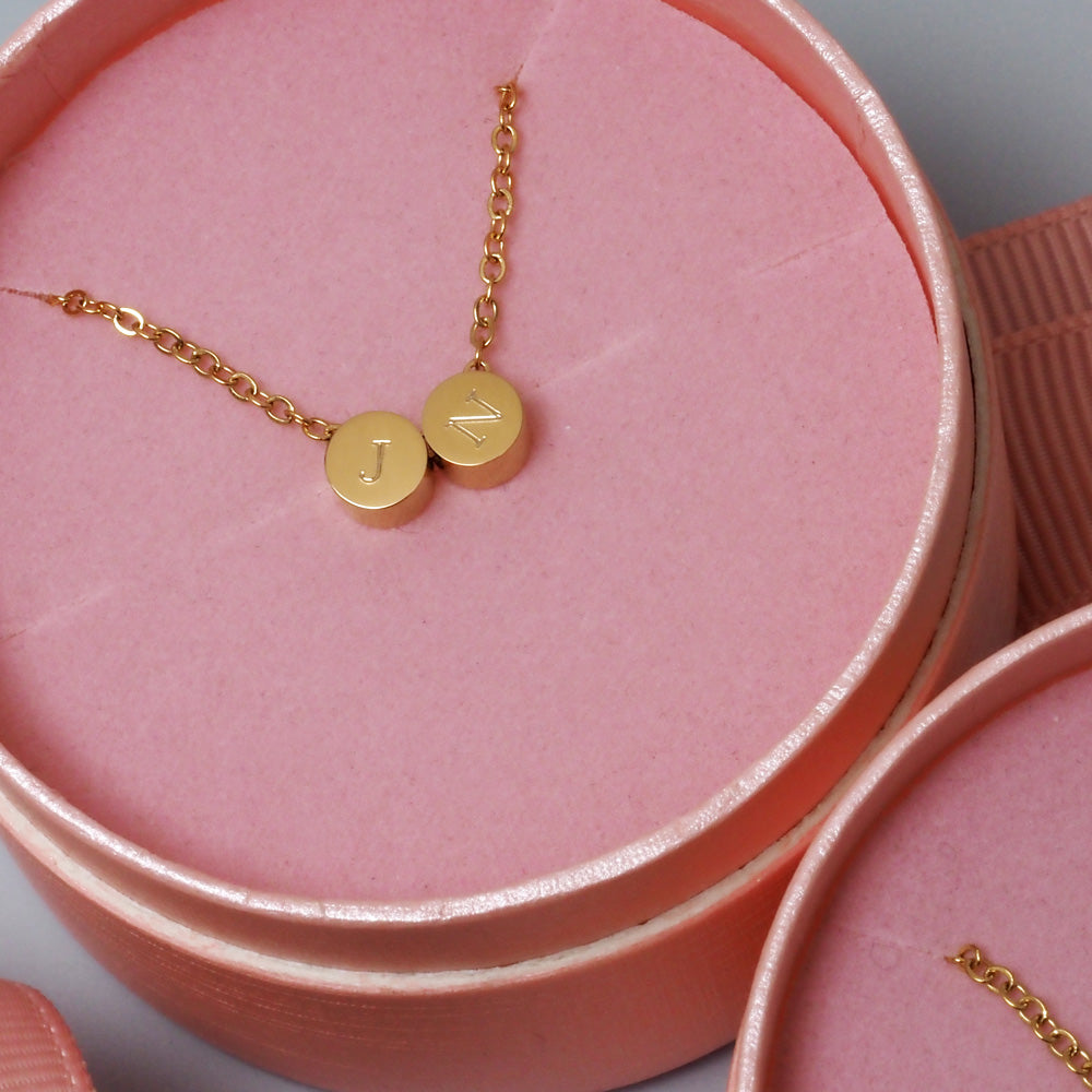 2 initial necklace, engraved and packed in iconic ELVIE pink gift box