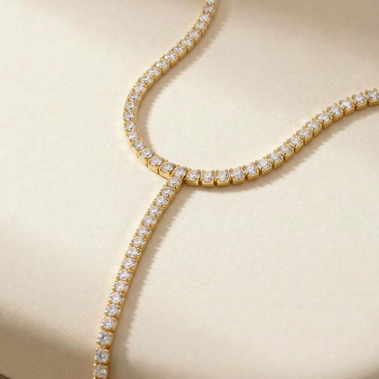 A modern take on the classic tennis silhouette, reimagined as a fluid lariat. Designed to elongate the neckline and command attention, the 9cm drop creates a sculpted, intentional finish.